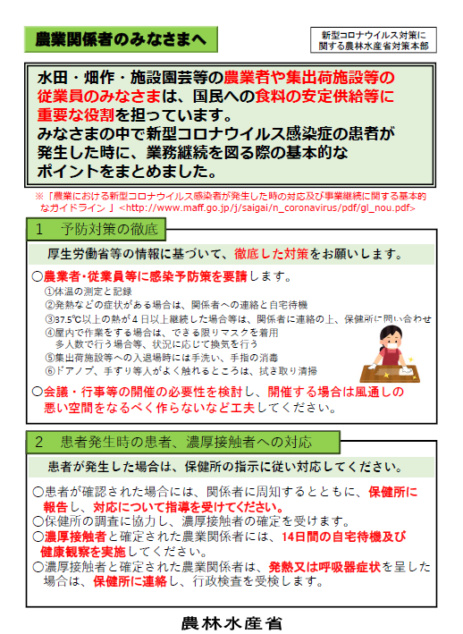 新型コロナウイルス対策に関するガイドラインについて(農林水産業版) 告示・公示 厚生労働省並びに農林水産省より示された新型コロナウイルス対策に関するガイドラインをお示しいたします。 つきましては、集荷業者並びに生産者各位へご周知ください。